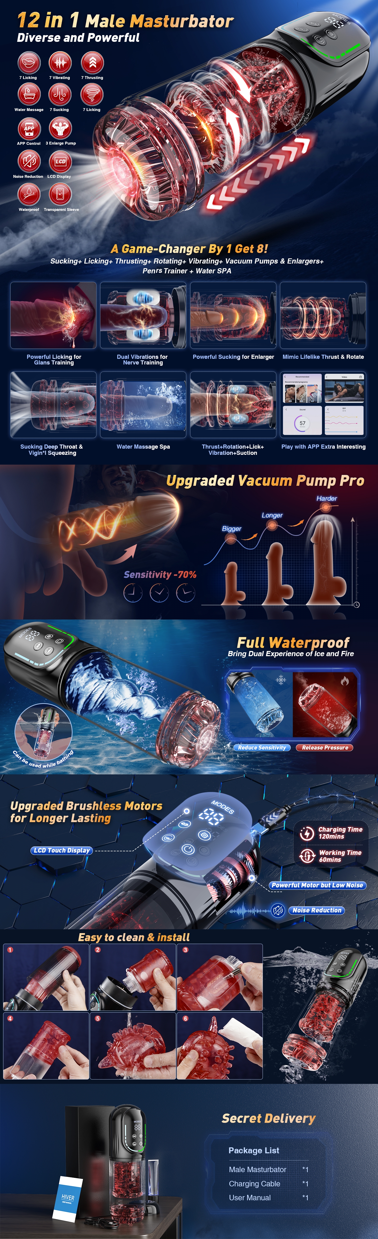 Multifunktionales Lustgerät: Kombiniert Stoßen, Rotieren, Saugen, Lecken, Vibrieren, Vakuumpumpen, Penistraining und wasserdichte Spa-Massage – ein Allrounder für ultimative Stimulation.
