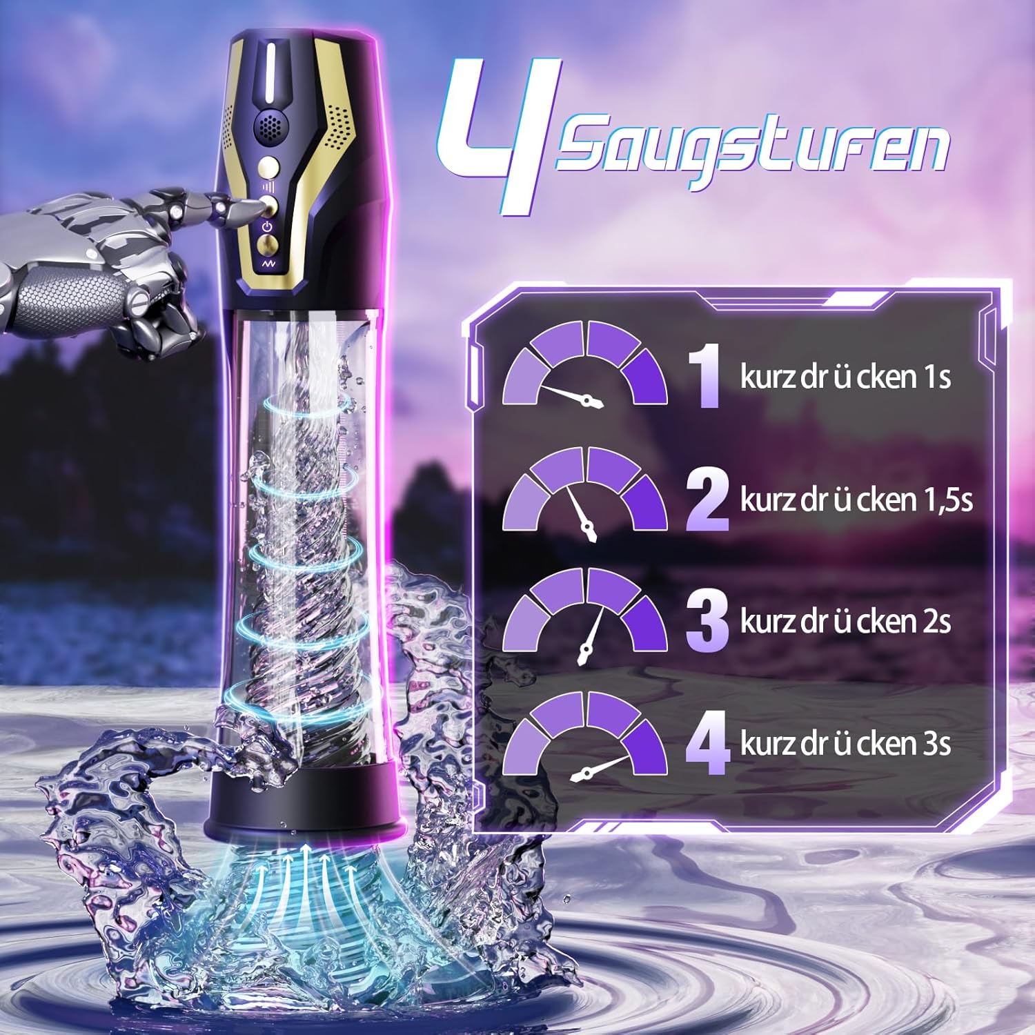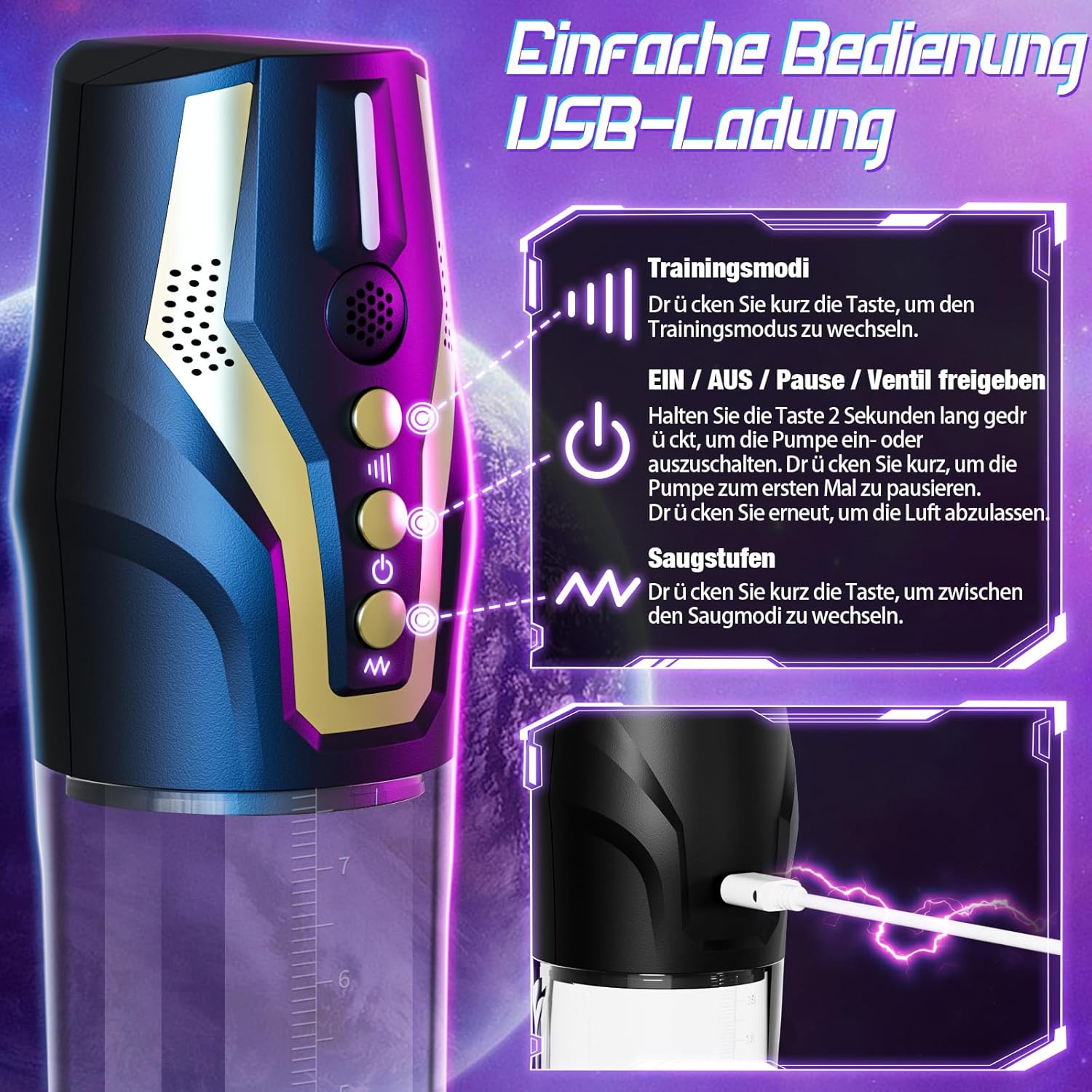 - Elektrische penispumpe mit 4 Saugstufen und 4 Trainingsmodi: Der masturbator männer verfügt über 4 Trainingsmodi, die die Durchblutung von Penis und Eichel beschleunigen. Der mastrubrator für manner bietet außerdem 4 Saugstufen, die das Gefühl eines Blowjobs nachahmen. Mit diesem sex toys erreichen Sie ein effektives Penistraining. Wenn die gewünschte Erektion erreicht ist, können Sie den Druck durch Drücken des Entriegelungsknopfes ablassen, zu Ihrer Sicherheit jederzeit pausieren und entlüften